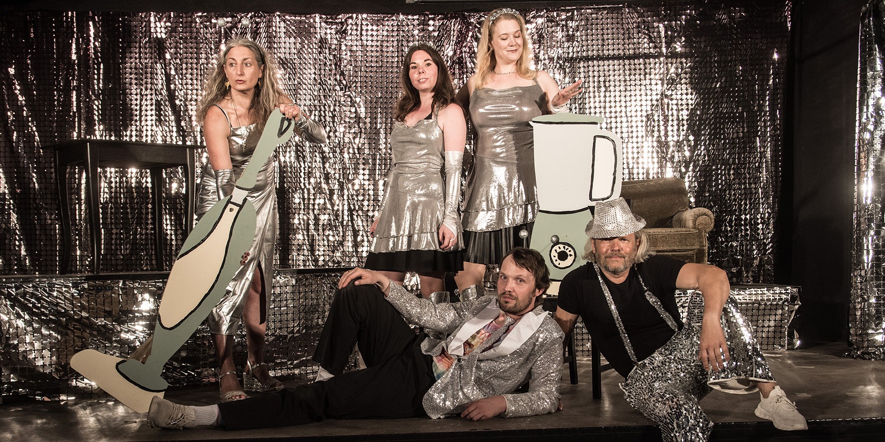 Theater der Liebe, Freinsheim – Die fünf Schauspieler*innen auf der Bühne spielten in ihren Glitzergewändern jeweils eine Erscheinungsversion des KI-Roboters Alekto